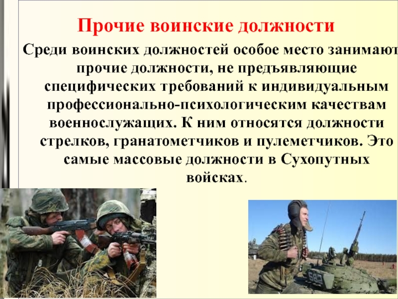 предъявляющие специфических требований к индивидуальным профессионально-психологическим качествам военнослужащих. К ним относятся должности стрелков, гранатометчиков и пулеметчиков. Это самые массовые должности в Сухопутных войсках.