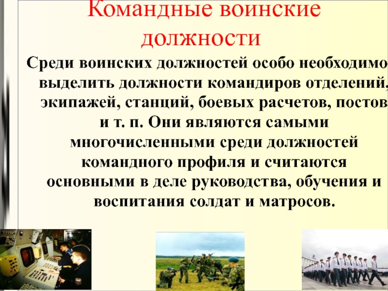 отделений, экипажей, станций, боевых расчетов, постов и т. п. Они являются самыми многочисленными среди должностей командного профиля и считаются основными в деле руководства, обучения и воспитания солдат и матросов.
