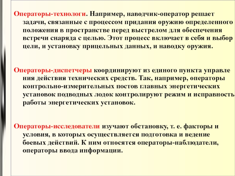 Операторы-технологи. Например, наводчик-оператор решает задачи, связанные с процессом придания оружию