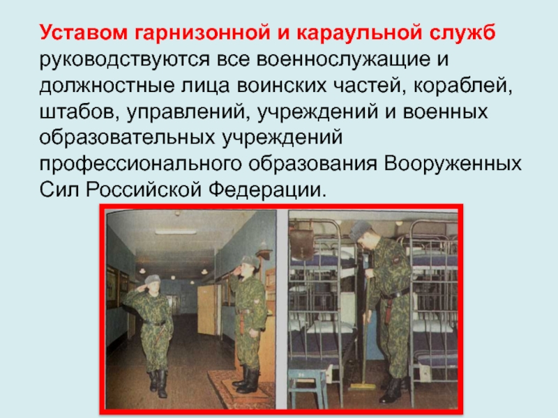 Слайд 9 Уставом гарнизонной и караульной служб руководствуются все военнослужащие и
