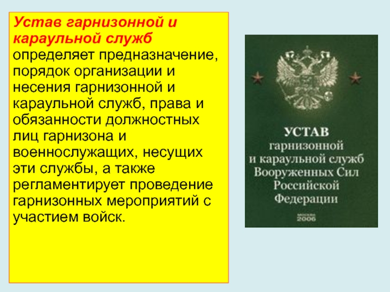 гарнизонной и караульной служб, права и обязанности должностных лиц гарнизона и военнослужащих, несущих эти службы, а также регламентирует проведение гарнизонных мероприятий с участием войск.
