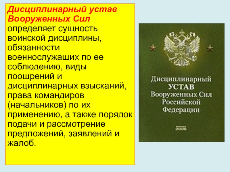 Слайд 6Дисциплинарный устав Вооруженных Сил определяет сущность воинской дисциплины, обязанности военнослужащих по