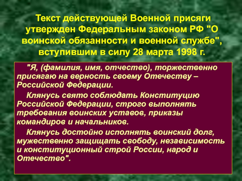 Текст действующей Военной присяги утвержден Федеральным законом РФ