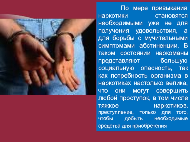 не для получения удовольствия, а для борьбы с мучительными симптомами абстиненции. В таком состоянии наркоманы представляют большую социальную опасность, так как потребность организма в наркотиках настолько велика, что они могут совершить любой проступок, в том числе тяжкое наркотиков. преступление, только для того, чтобы добыть необходимые средства для приобретения