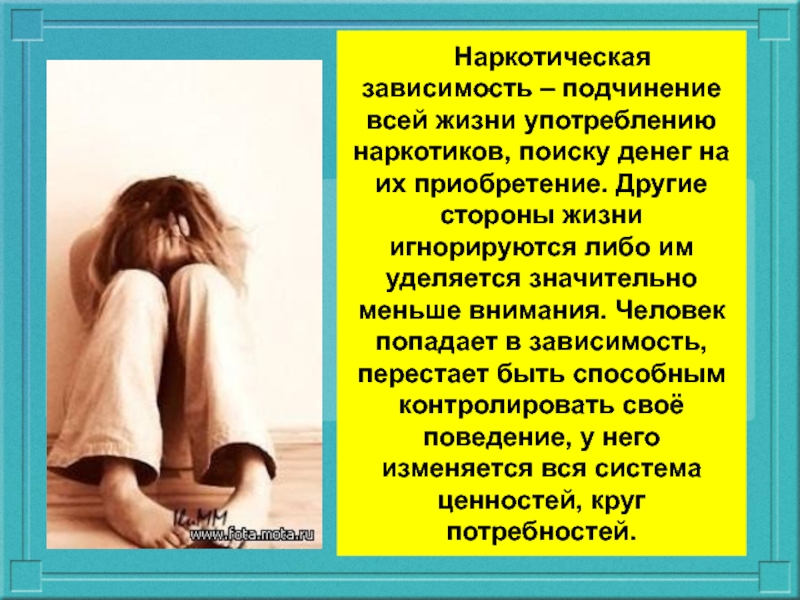 Слайд 13 Наркотическая зависимость – подчинение всей жизни употреблению наркотиков, поиску