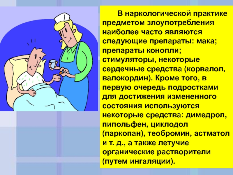 Слайд 6 В наркологической практике предметом злоупотребления наиболее часто