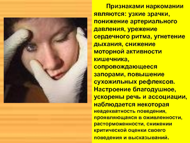 Слайд 7 Признаками наркомании являются: узкие зрачки, понижение артериального