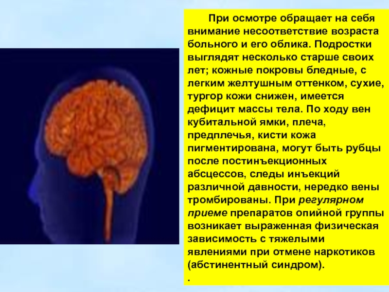 возраста больного и его облика. Подростки выглядят несколько старше своих лет; кожные покровы бледные, с легким желтушным оттенком, сухие, тургор кожи снижен, имеется дефицит массы тела. По ходу вен кубитальной ямки, плеча, предплечья, кисти кожа пигментирована, могут быть рубцы после постинъекционных абсцессов, следы инъекций различной давности, нередко вены тромбированы. При регулярном приеме препаратов опийной группы возникает выраженная физическая зависимость с тяжелыми явлениями при отмене наркотиков (абстинентный синдром).