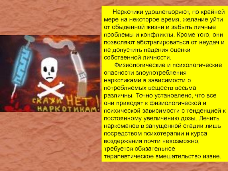 Слайд 5 Наркотики удовлетворяют, по крайней мере на некоторое время,