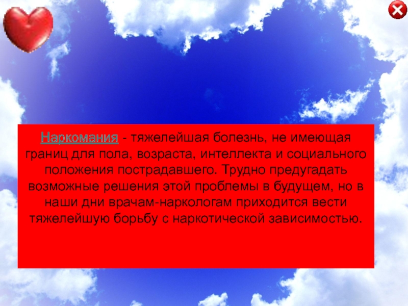 Слайд 15Наркомания - тяжелейшая болезнь, не имеющая границ для пола, возраста, интеллекта