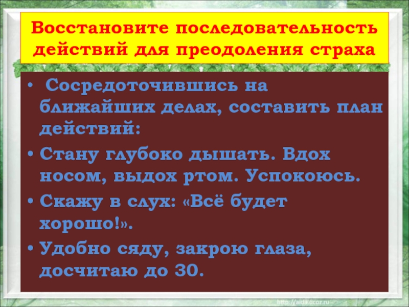 Слайд 3Восстановите последовательность действий для преодоления страха