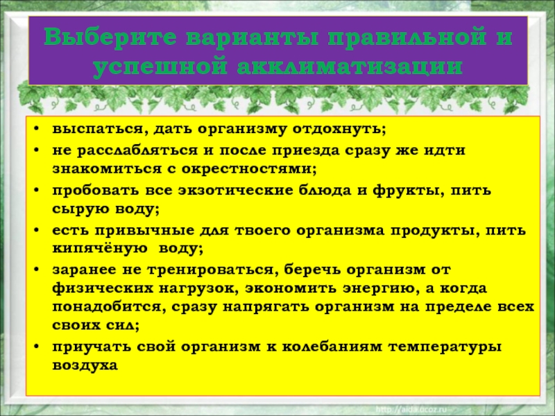 Слайд 5Выберите варианты правильной и успешной акклиматизации