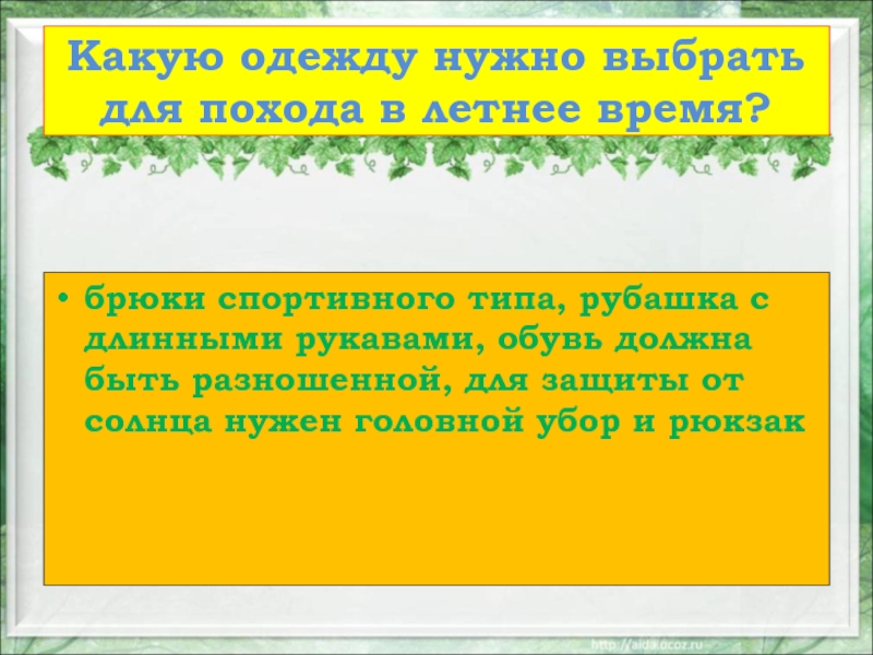 Слайд 4Какую одежду нужно выбрать для похода в летнее время?
