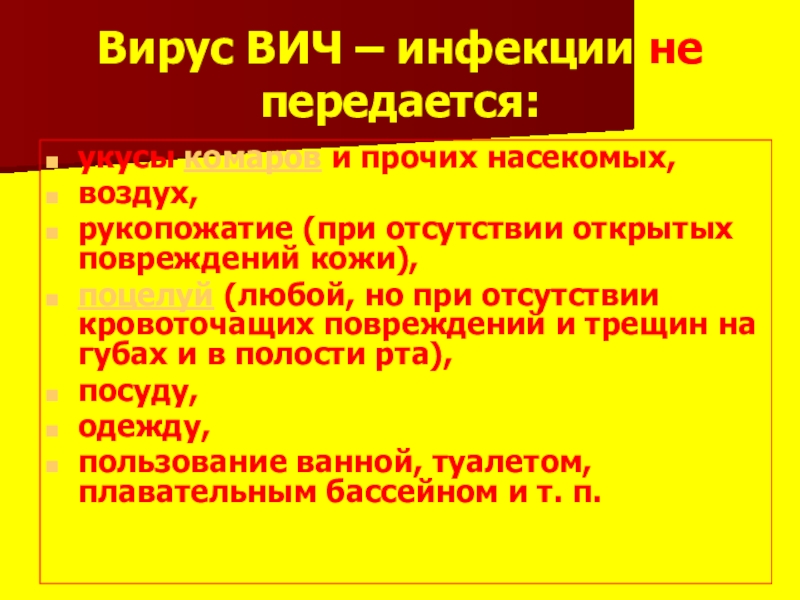 Вирус ВИЧ – инфекции не передается: укусы комаров и прочих насекомых,воздух,рукопожатие (при отсутствии открытых повреждений кожи),поцелуй (любой,