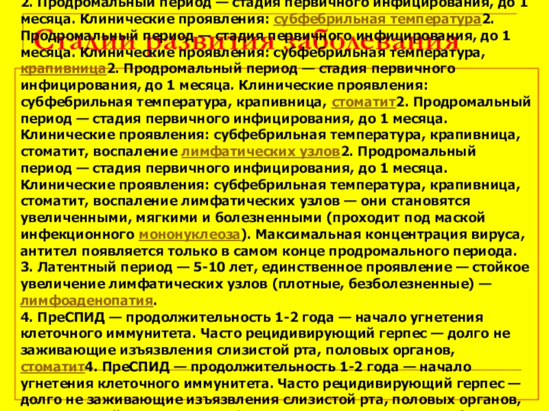 2. Продромальный период — стадия первичного инфицирования, до 1 месяца. Клинические проявления: субфебрильная температура2. Продромальный период — стадия первичного инфицирования, до 1 месяца. Клинические проявления: субфебрильная температура, крапивница2. Продромальный период — стадия первичного инфицирования, до 1 месяца. Клинические проявления: субфебрильная температура, крапивница, стоматит2. Продромальный период — стадия первичного инфицирования, до 1 месяца. Клинические проявления: субфебрильная температура, крапивница, стоматит, воспаление лимфатических узлов2. Продромальный период — стадия первичного инфицирования, до 1 месяца. Клинические проявления: субфебрильная температура, крапивница, стоматит, воспаление лимфатических узлов — они становятся увеличенными, мягкими и болезненными (проходит под маской инфекционного мононуклеоза). Максимальная концентрация вируса, антител появляется только в самом конце продромального периода.
