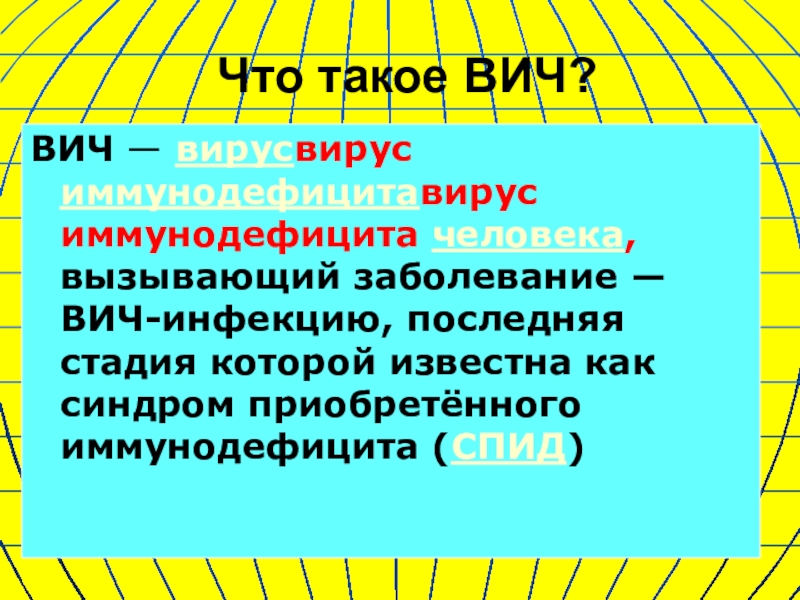 Что такое ВИЧ?ВИЧ — вирусвирус иммунодефицитавирус иммунодефицита человека, вызывающий заболевание — ВИЧ-инфекцию, последняя стадия которой известна как синдром приобретённого иммунодефицита (СПИД)