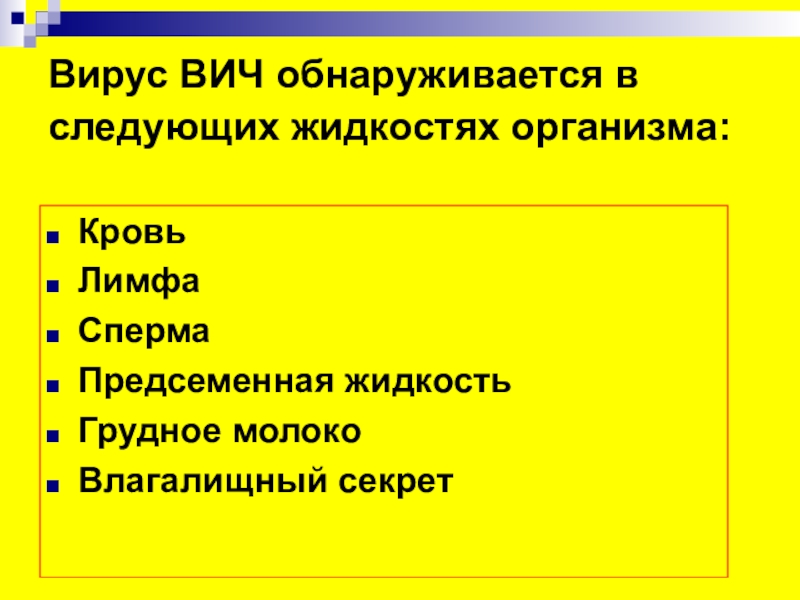 Вирус ВИЧ обнаруживается в следующих жидкостях организма: КровьЛимфаСпермаПредсеменная жидкостьГрудное молокоВлагалищный секрет
