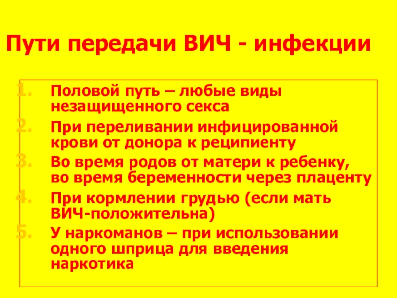 Пути передачи ВИЧ - инфекцииПоловой путь – любые виды незащищенного сексаПри переливании инфицированной крови от донора к