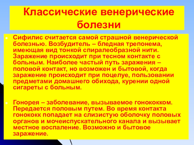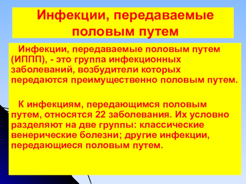 К инфекциям, передающимся половым путем, относятся 22 заболевания. Их условно разделяют на две группы: классические венерические болезни; другие инфекции, передающиеся половым путем.