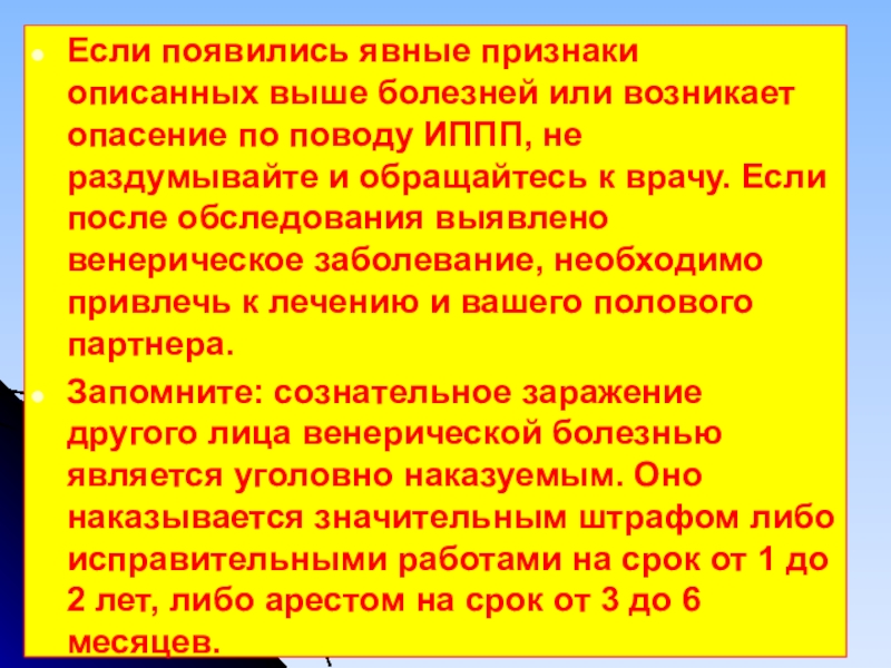 Запомните: сознательное заражение другого лица венерической болезнью является уголовно наказуемым. Оно наказывается значительным штрафом либо исправительными работами на срок от 1 до 2 лет, либо арестом на срок от 3 до 6 месяцев.