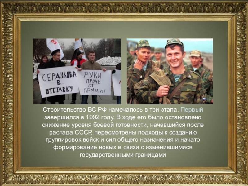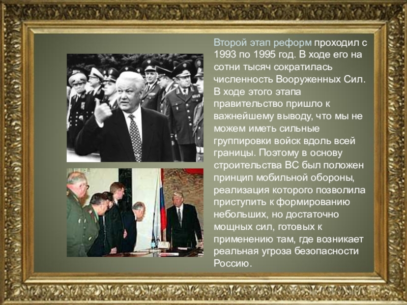 его на сотни тысяч сократилась численность Вооруженных Сил. В ходе этого этапа правительство пришло к важнейшему выводу, что мы не можем иметь сильные группировки войск вдоль всей границы. Поэтому в основу строительства ВС был положен принцип мобильной обороны, реализация которого позволила приступить к формированию небольших, но достаточно мощных сил, готовых к применению там, где возникает реальная угроза безопасности Россию.
