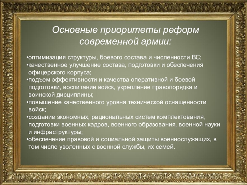 создание экономных, рациональных систем комплектования, подготовки военных кадров, военного образования, военной науки и инфраструктуры;