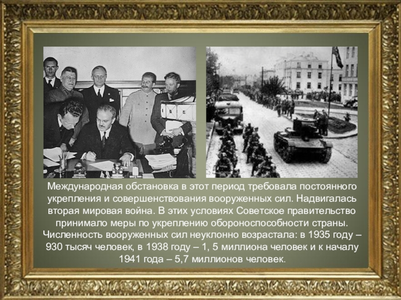 сил. Надвигалась вторая мировая война. В этих условиях Советское правительство принимало меры по укреплению обороноспособности страны. Численность вооруженных сил неуклонно возрастала: в 1935 году – 930 тысяч человек, в 1938 году – 1, 5 миллиона человек и к началу 1941 года – 5,7 миллионов человек.