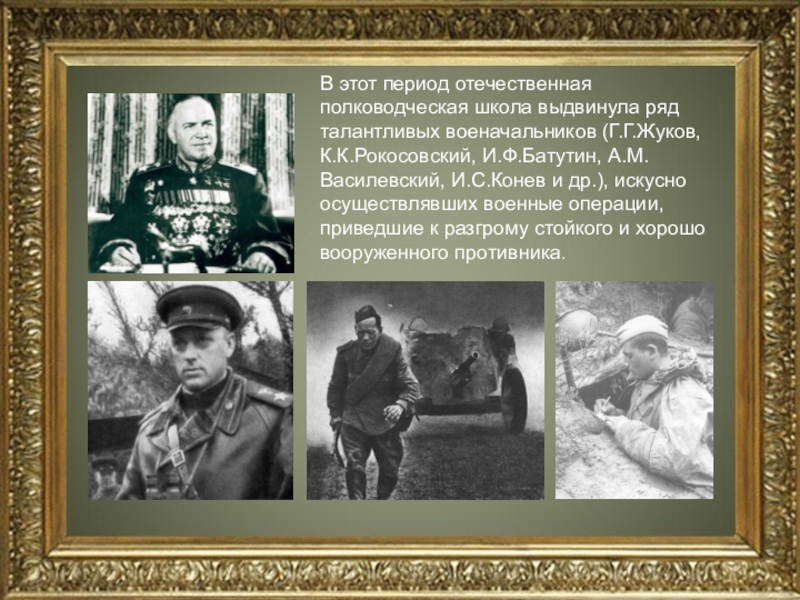 В этот период отечественная полководческая школа выдвинула ряд талантливых военачальников (Г.Г.Жуков,