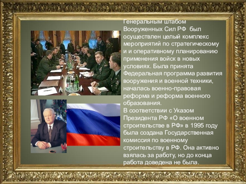 стратегическому и и оперативному планированию применения войск в новых условиях. Была принята Федеральная программа развития вооружения и военной техники, началась военно-правовая реформа и реформа военного образования.