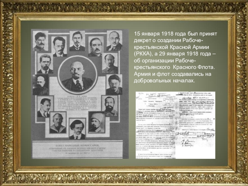 Армии (РККА), а 29 января 1918 года – об организации Рабоче-крестьянского Красного Флота. Армия и флот создавались на добровольных началах.