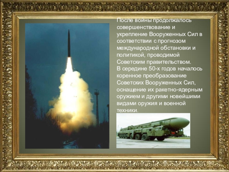После войны продолжалось совершенствование и укрепление Вооруженных Сил в соответствии с