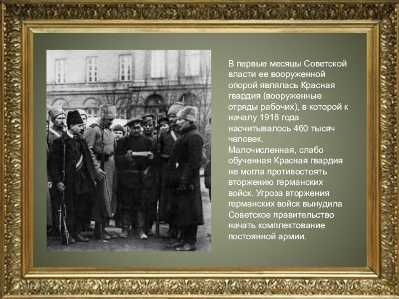 В первые месяцы Советской власти ее вооруженной опорой являлась Красная гвардия