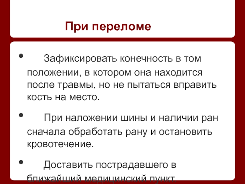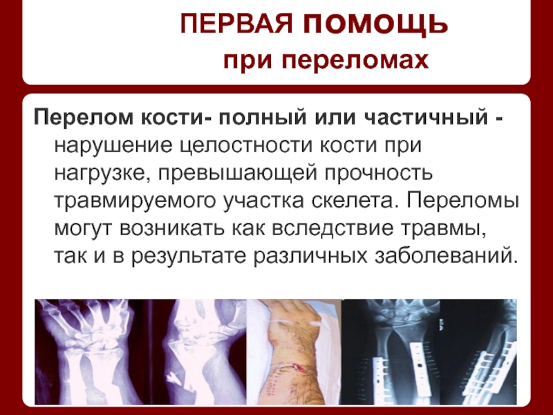 Перелом кости- полный или частичный - нарушение целостности кости при нагрузке, превышающей прочность травмируемого участка скелета. Переломы могут возникать как вследствие травмы, так и в результате различных заболеваний.