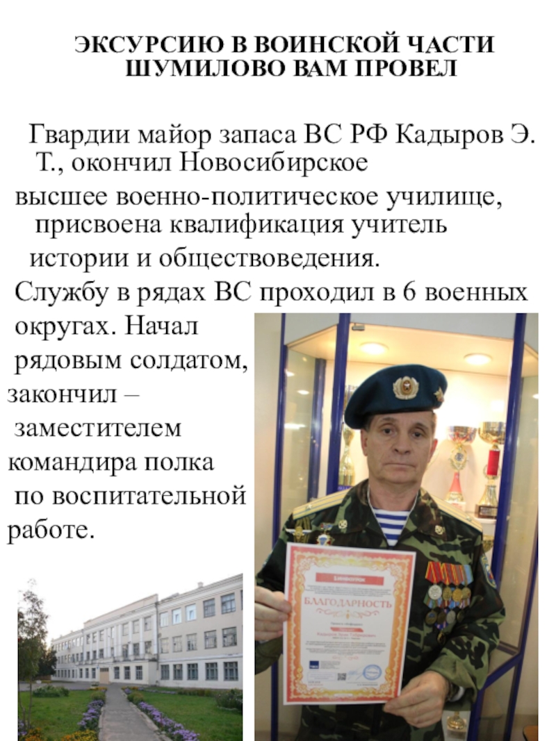 ЭКСУРСИЮ В ВОИНСКОЙ ЧАСТИ ШУМИЛОВО ВАМ ПРОВЕЛ     Гвардии майор запаса