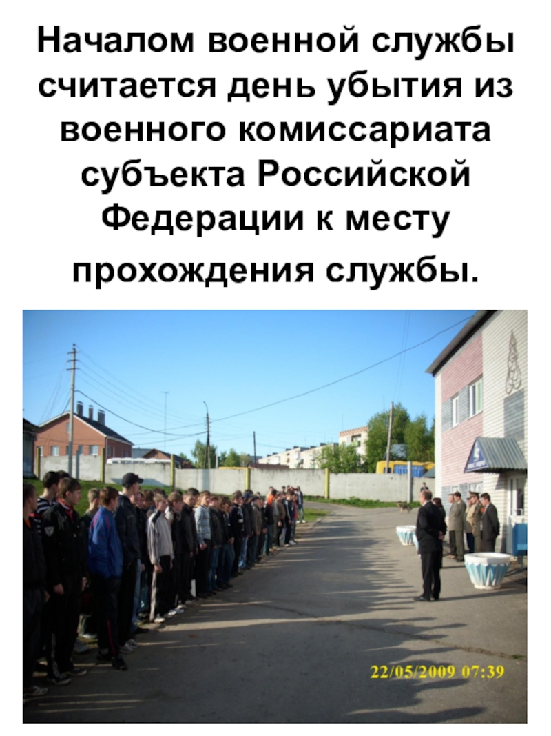 Слайд 2Началом военной службы считается день убытия из военного комиссариата субъекта Российской