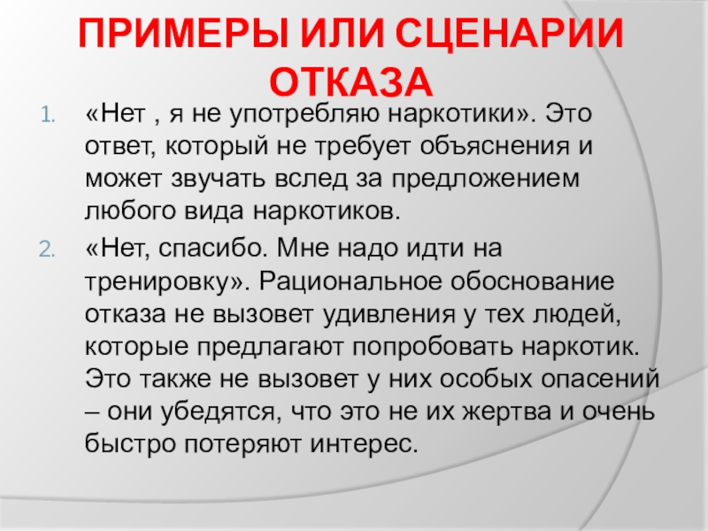 «Нет, спасибо. Мне надо идти на тренировку». Рациональное обоснование отказа не вызовет удивления у тех людей, которые предлагают попробовать наркотик. Это также не вызовет у них особых опасений – они убедятся, что это не их жертва и очень быстро потеряют интерес.