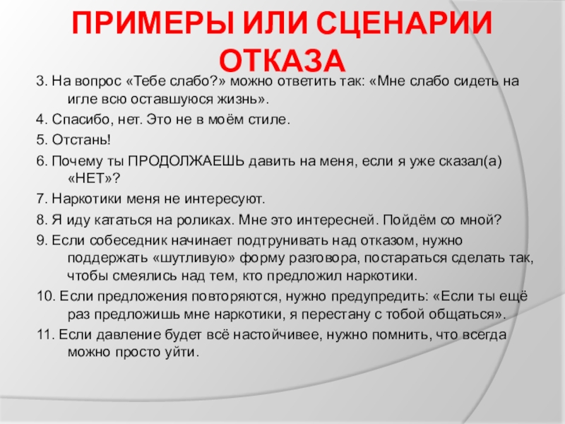 10. Если предложения повторяются, нужно предупредить: «Если ты ещё раз предложишь мне наркотики, я перестану с тобой общаться».