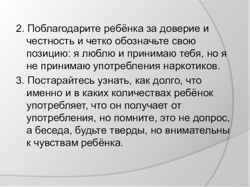 Слайд 202. Поблагодарите ребёнка за доверие и честность и четко обозначьте свою