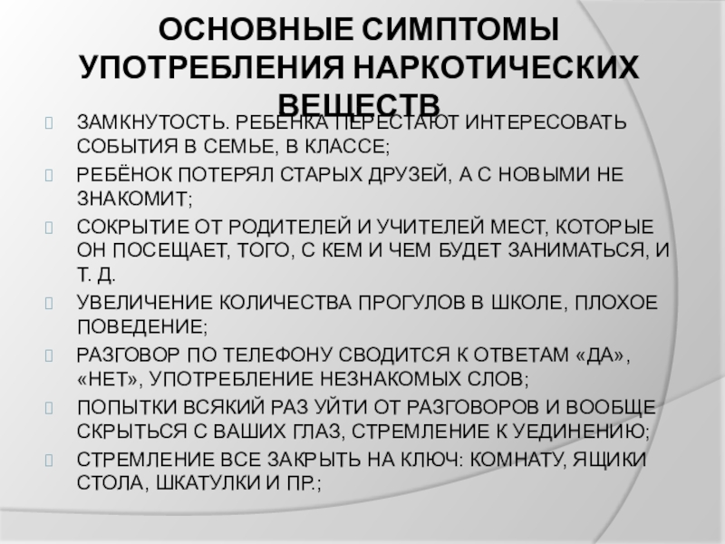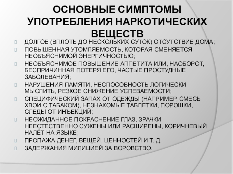 ОСНОВНЫЕ СИМПТОМЫ УПОТРЕБЛЕНИЯ НАРКОТИЧЕСКИХ ВЕЩЕСТВ