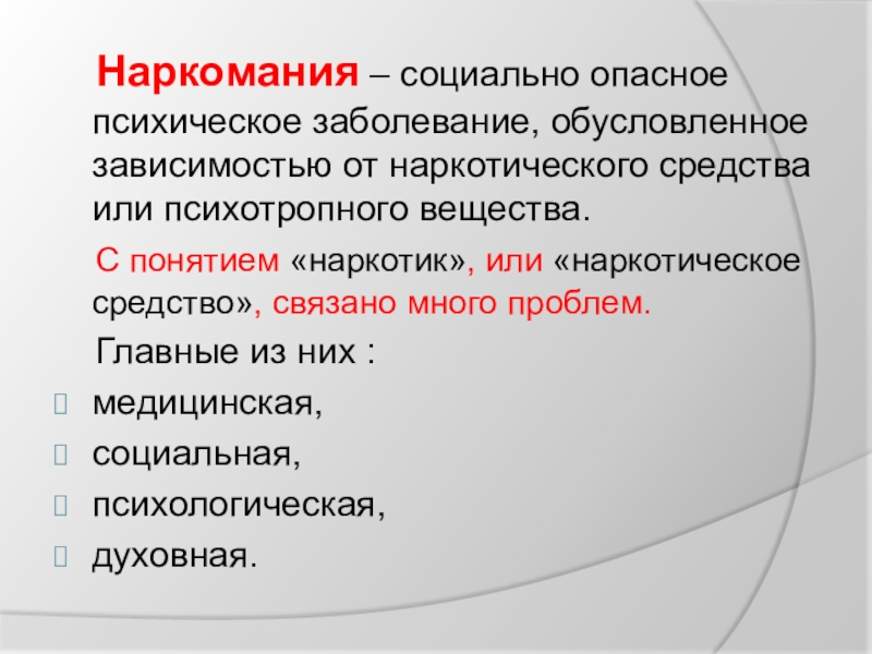 Слайд 2 Наркомания – социально опасное психическое заболевание, обусловленное зависимостью от наркотического средства