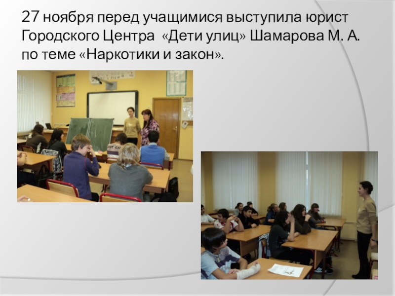 27 ноября перед учащимися выступила юрист Городского Центра «Дети улиц» Шамарова