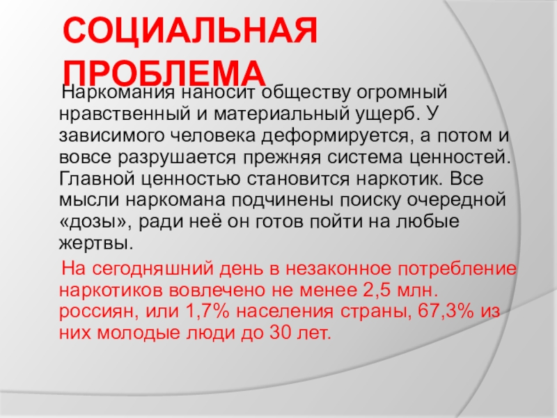 Наркомания наносит обществу огромный нравственный и материальный ущерб. У зависимого