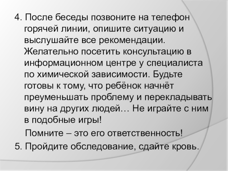 выслушайте все рекомендации. Желательно посетить консультацию в информационном центре у специалиста по химической зависимости. Будьте готовы к тому, что ребёнок начнёт преуменьшать проблему и перекладывать вину на других людей… Не играйте с ним в подобные игры!