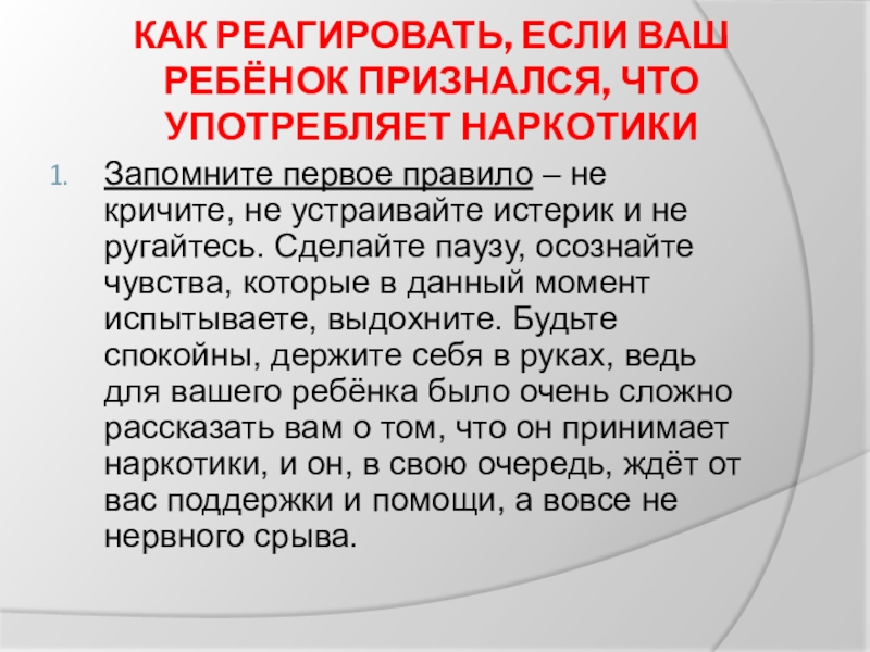 Слайд 19КАК РЕАГИРОВАТЬ, ЕСЛИ ВАШ РЕБЁНОК ПРИЗНАЛСЯ, ЧТО УПОТРЕБЛЯЕТ НАРКОТИКИ