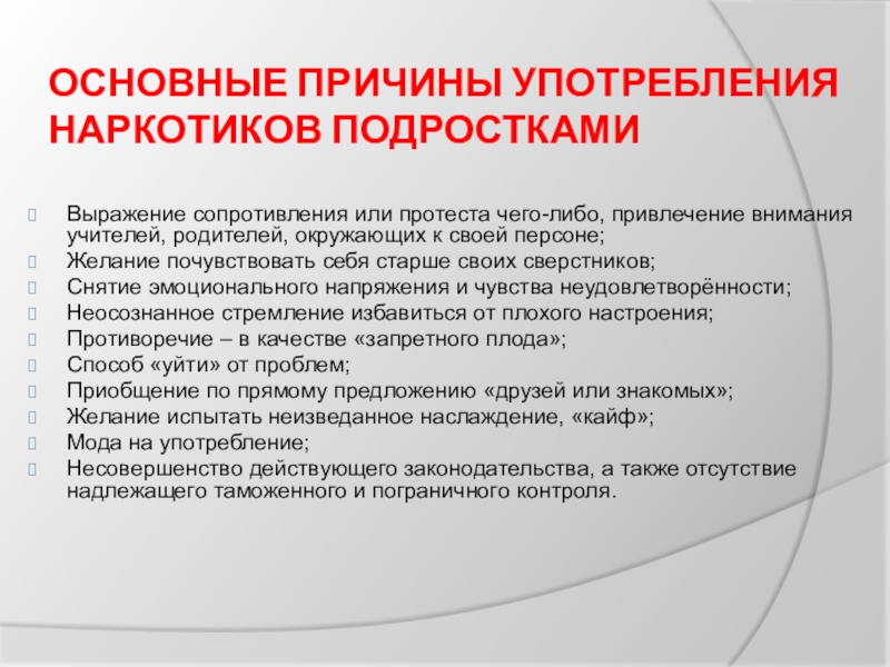 Слайд 6ОСНОВНЫЕ ПРИЧИНЫ УПОТРЕБЛЕНИЯ НАРКОТИКОВ ПОДРОСТКАМИ