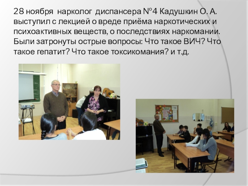 28 ноября нарколог диспансера №4 Кадушкин О. А. выступил с лекцией