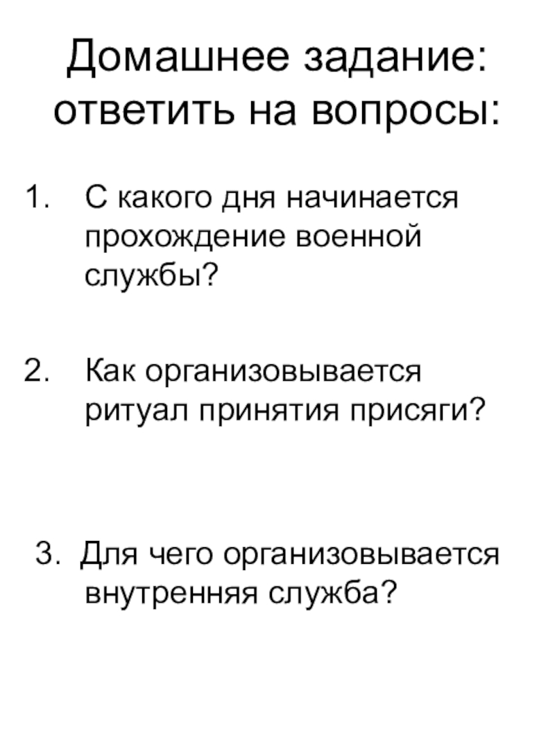 Домашнее задание: ответить на вопросы:С какого дня начинается прохождение военной службы?Как организовывается ритуал принятия присяги?3. Для чего