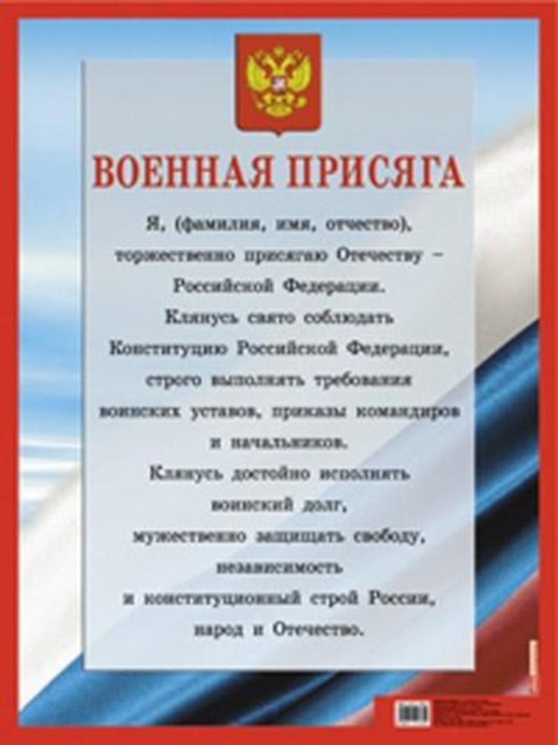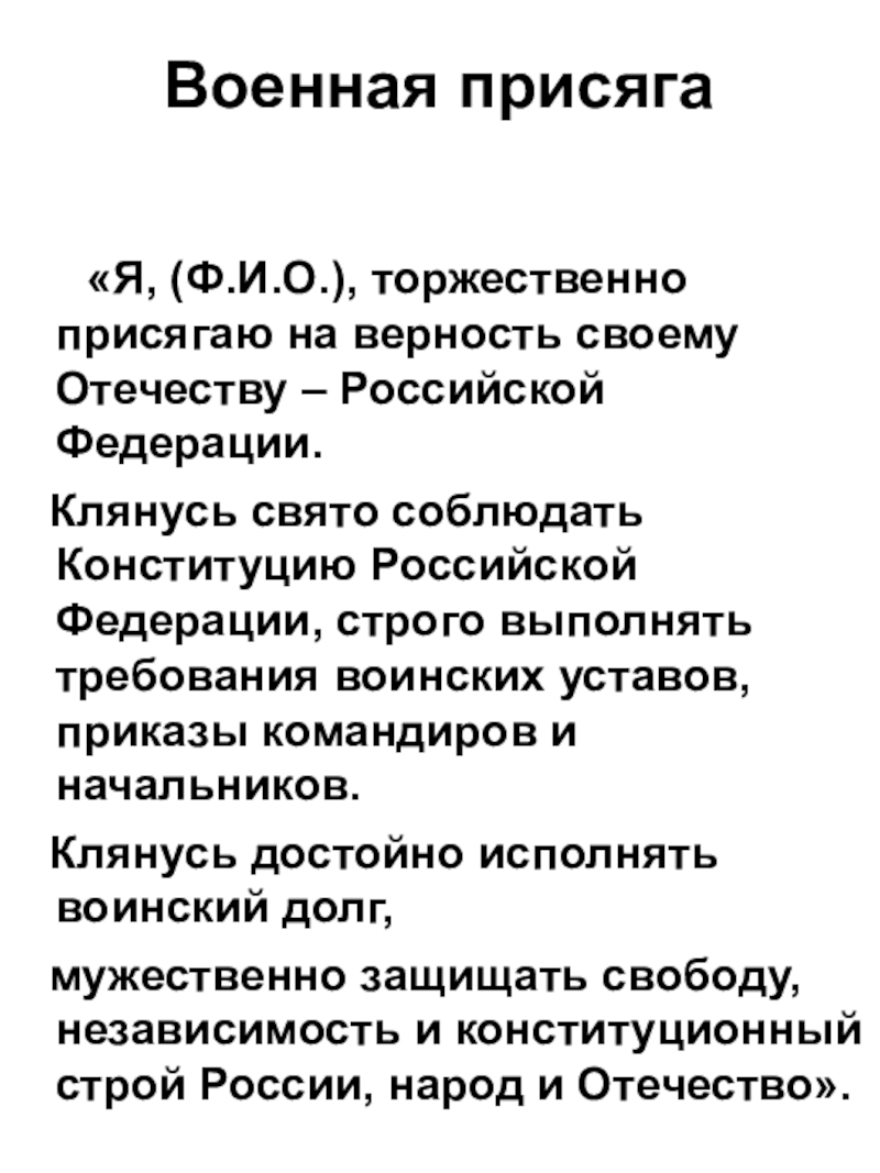 Военная присяга    «Я, (Ф.И.О.), торжественно присягаю на верность своему Отечеству – Российской Федерации.
