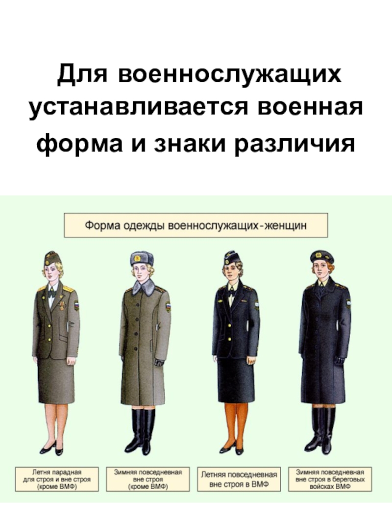 Слайд 40 Для военнослужащих устанавливается военная форма и знаки различия