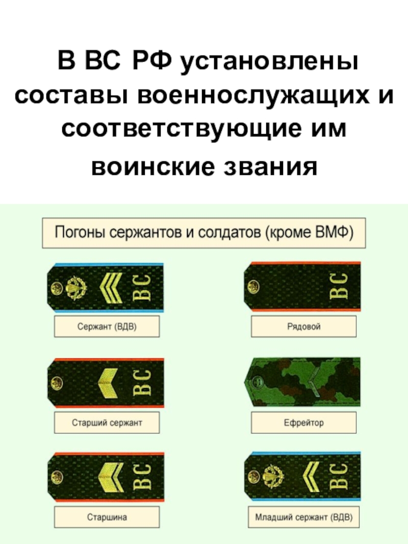 Слайд 39 В ВС РФ установлены составы военнослужащих и соответствующие им воинские